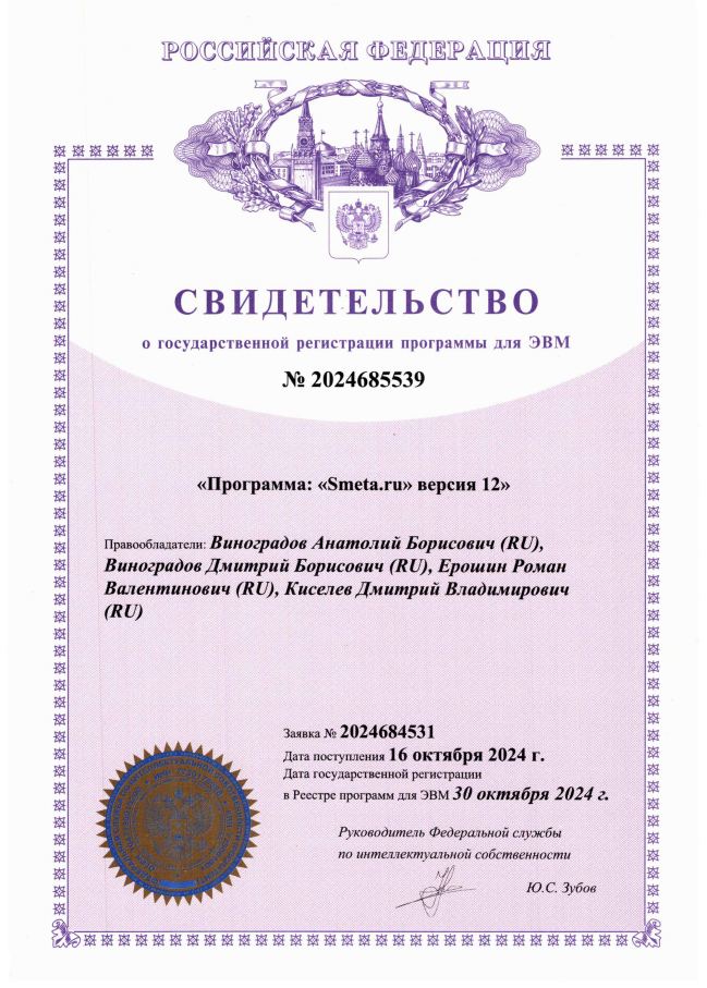 Свидетельство о государственной регистрации программы для ЭВМ: "Программа "Smeta.ru" версия 12"